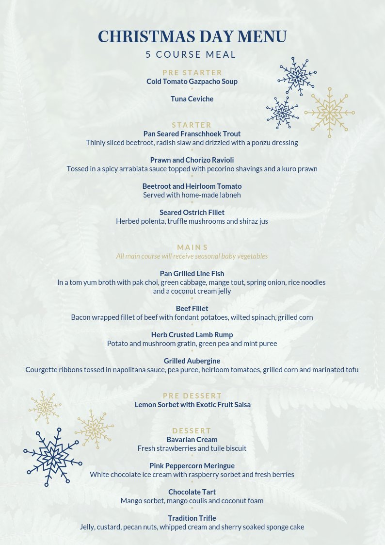 5 Course Lunch February 01, 2021Entertainment 5 Course Lunch : First course, a main course, and dessert.
